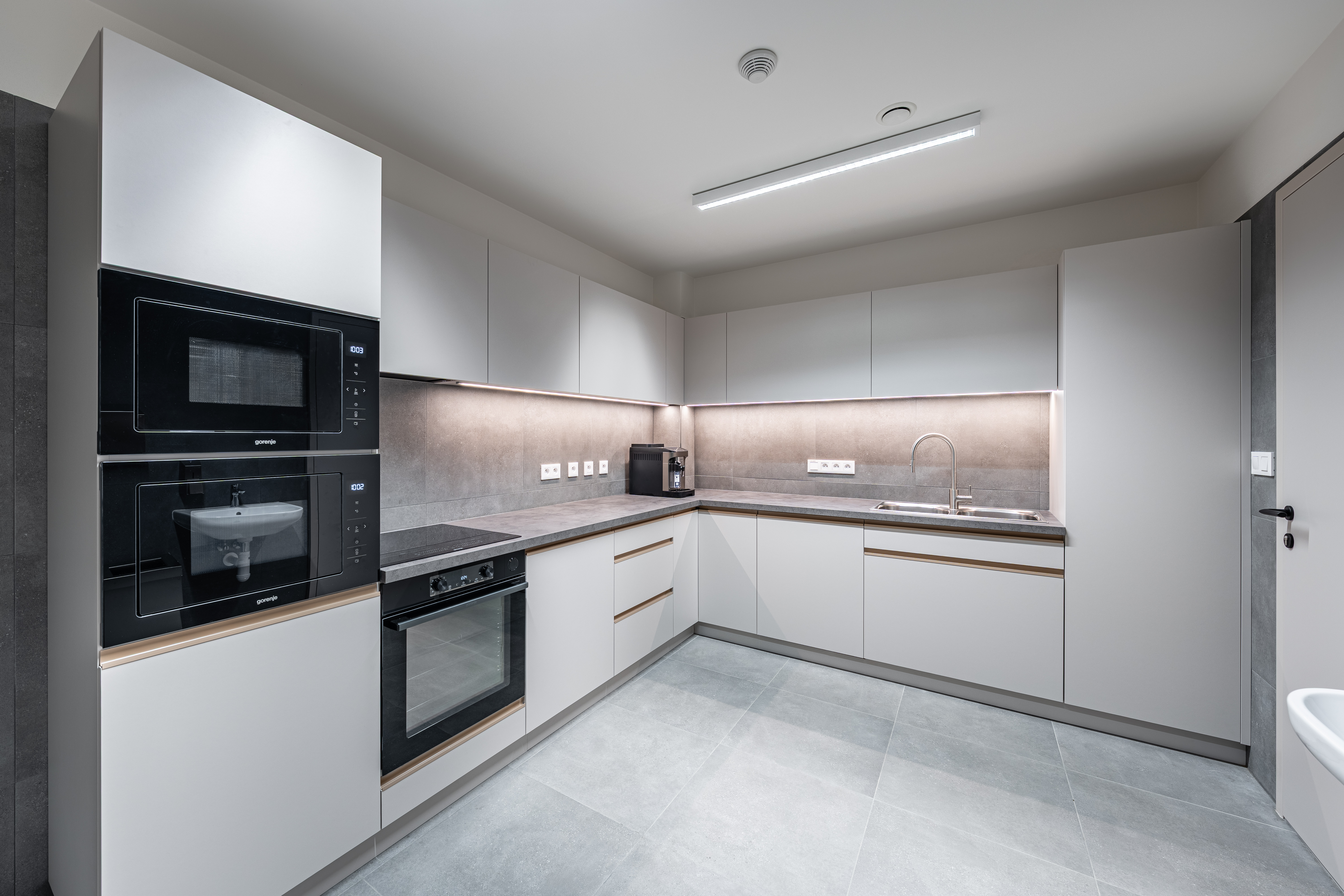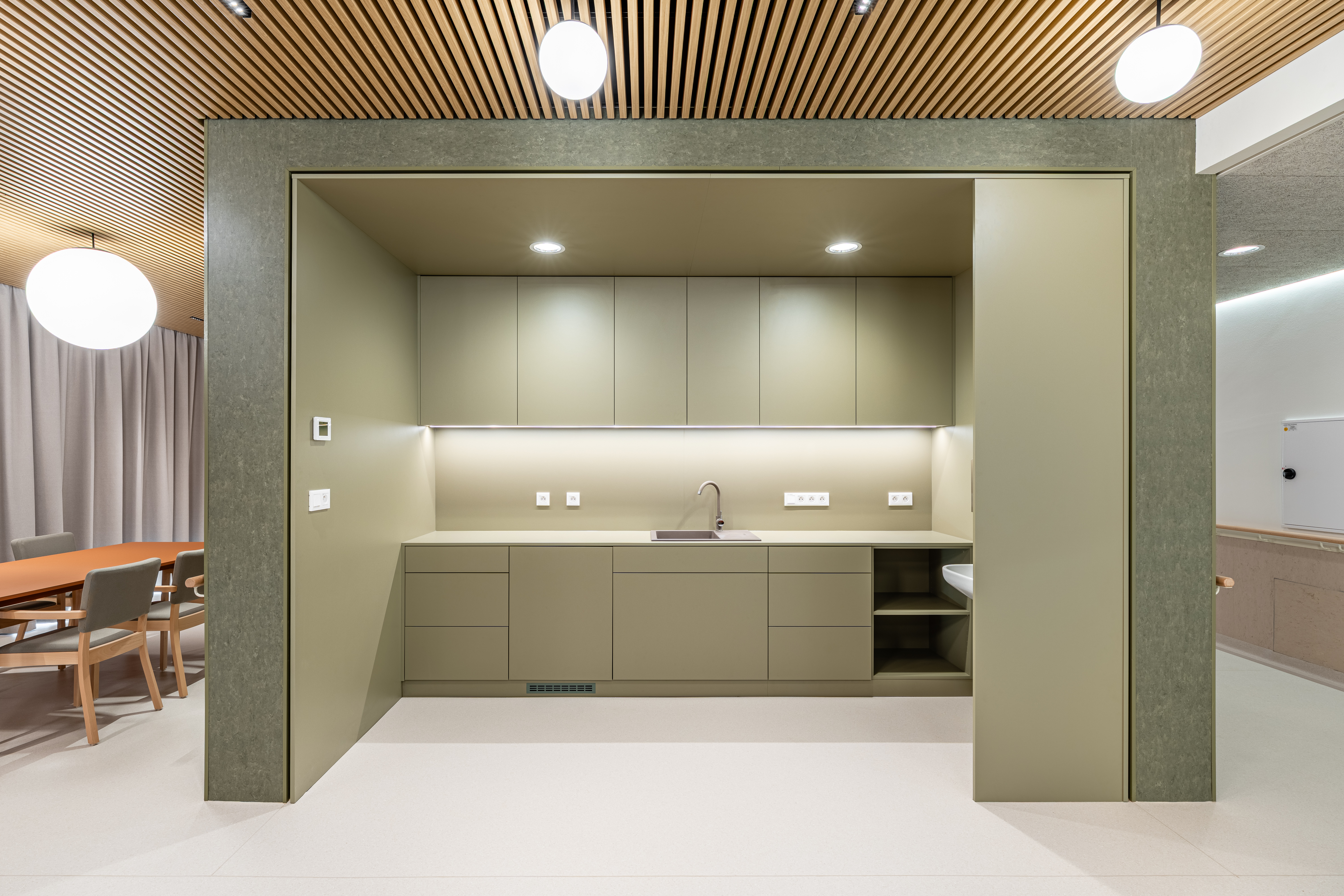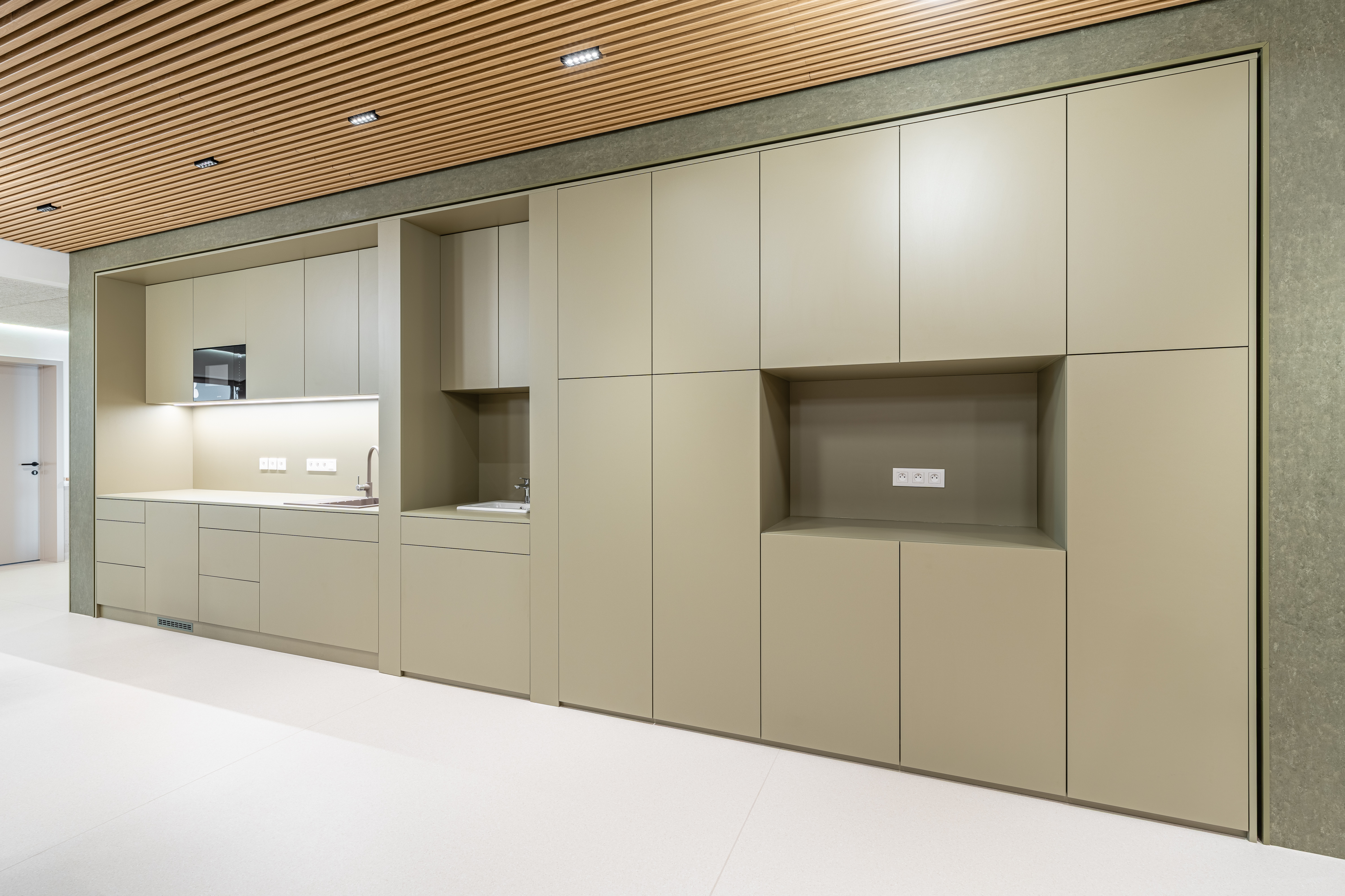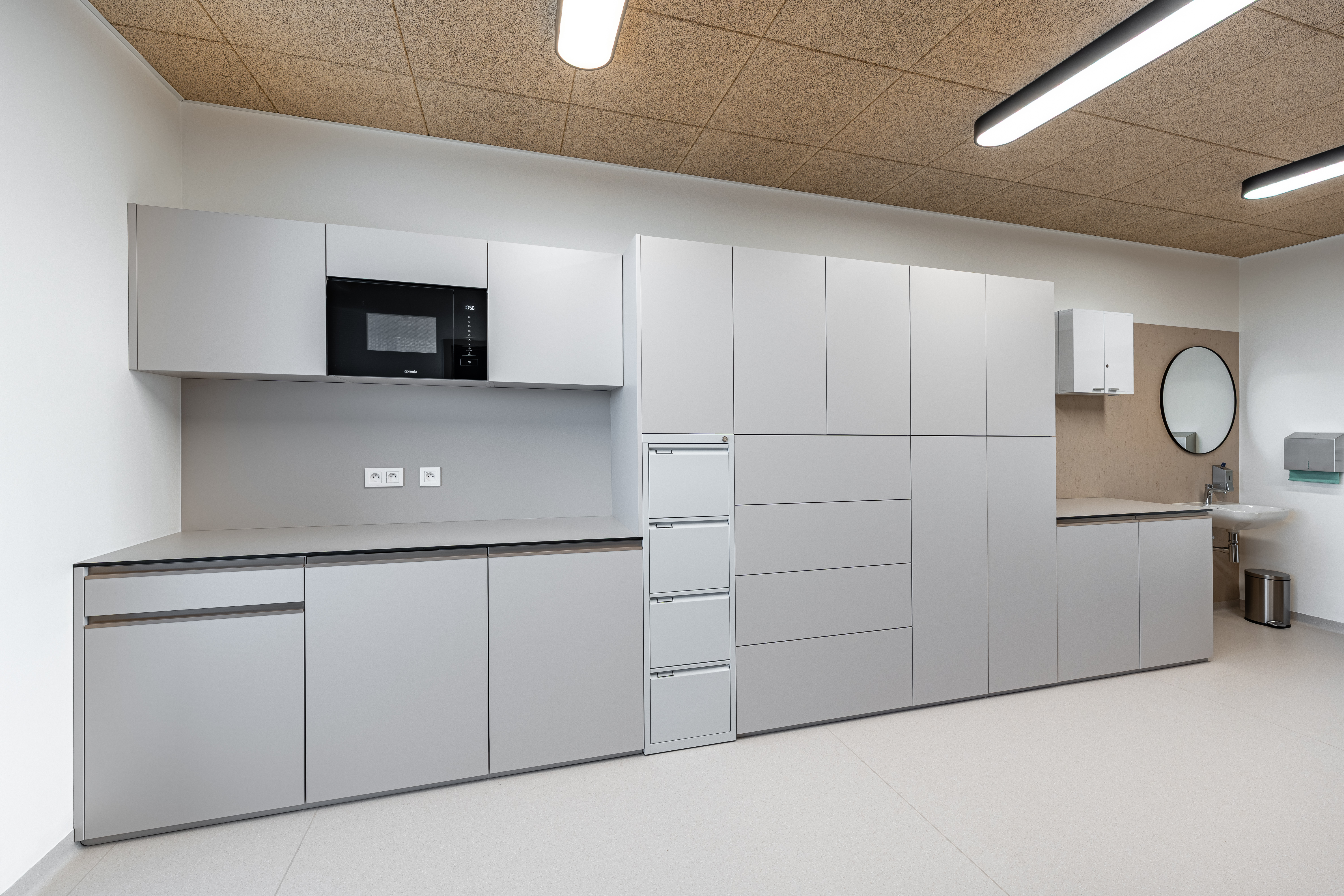 Interior furniture for doctors' offices, nurses' stations, conference rooms, stainless steel furniture for disinfection and cleaning rooms, entrance hall, and bistro.