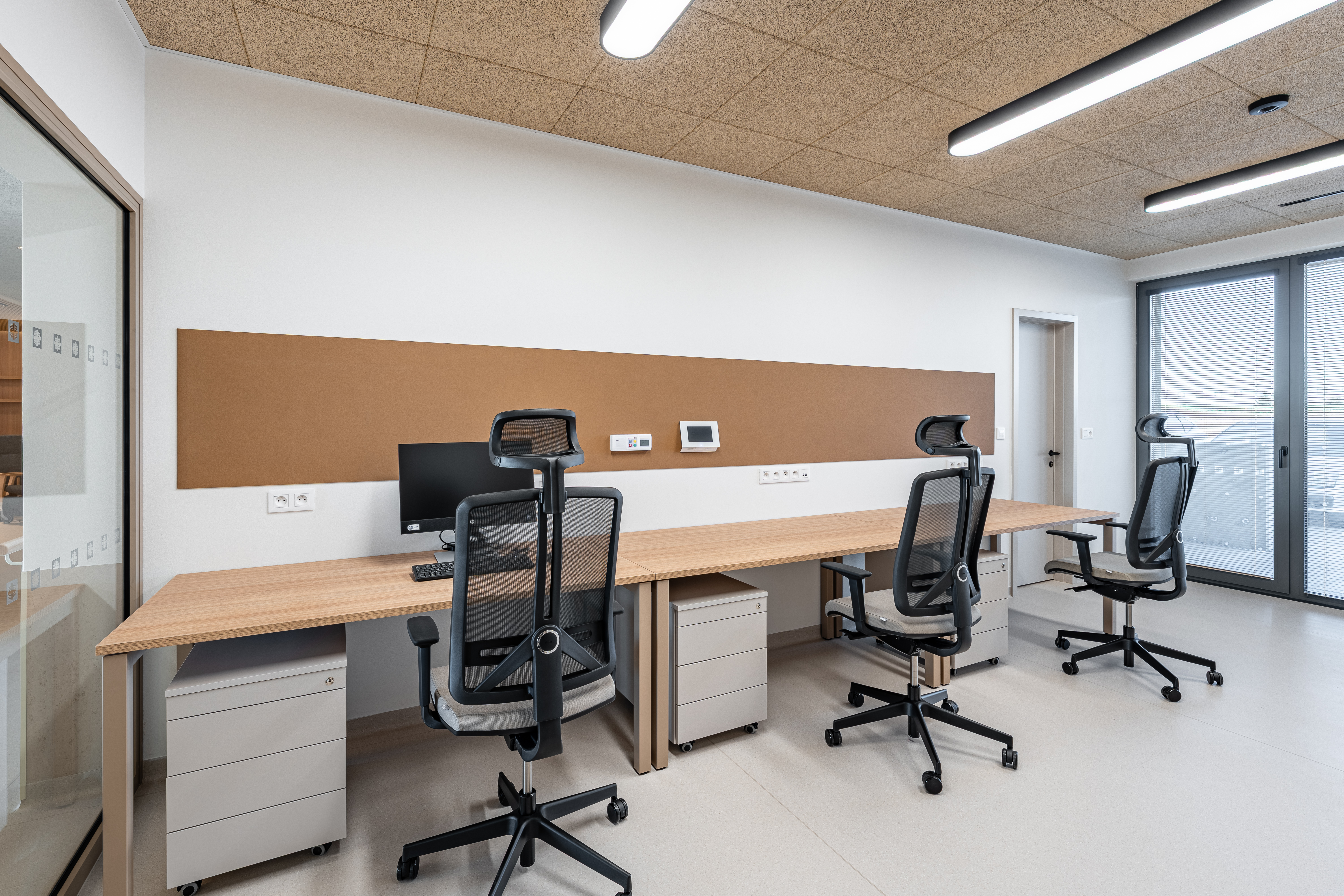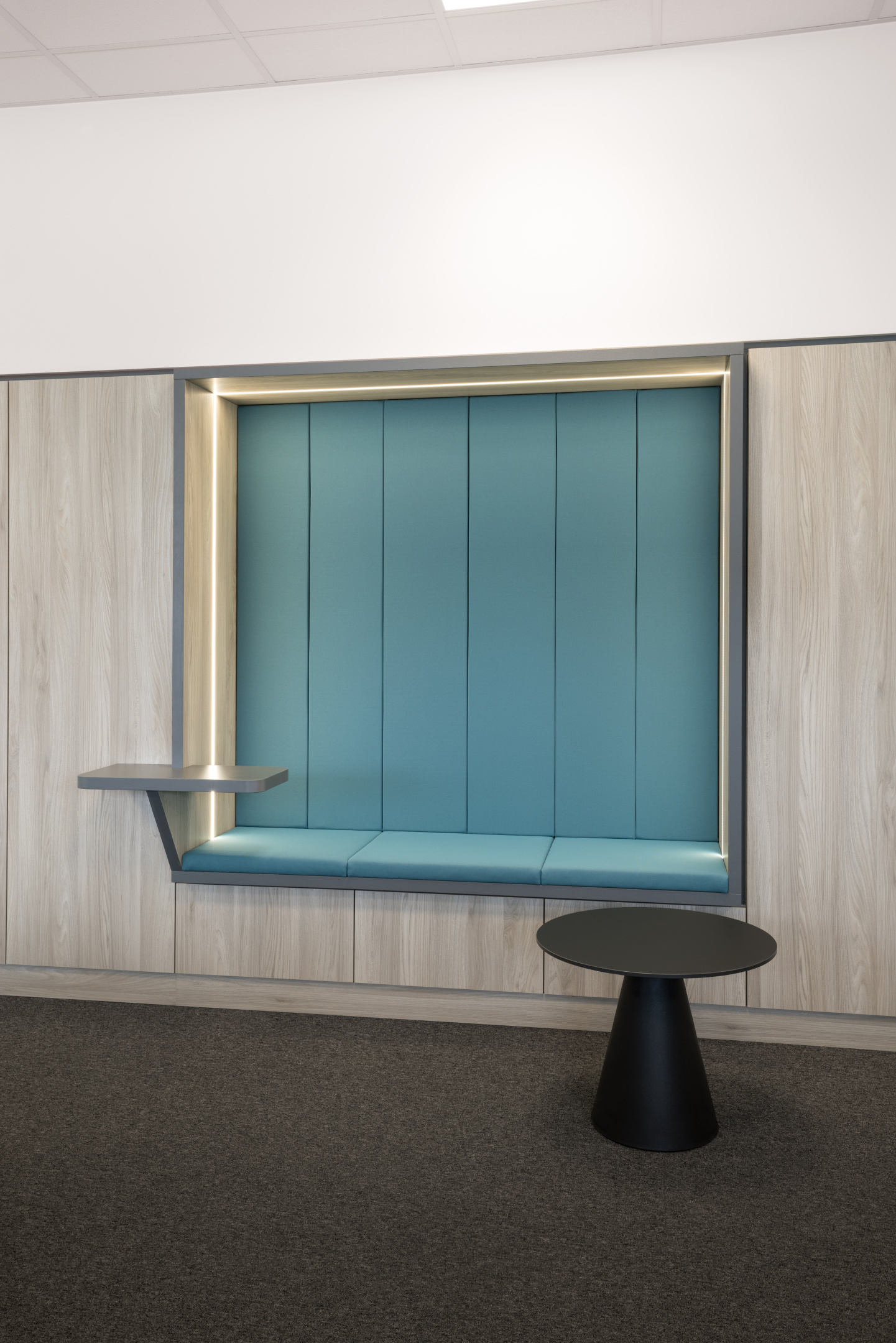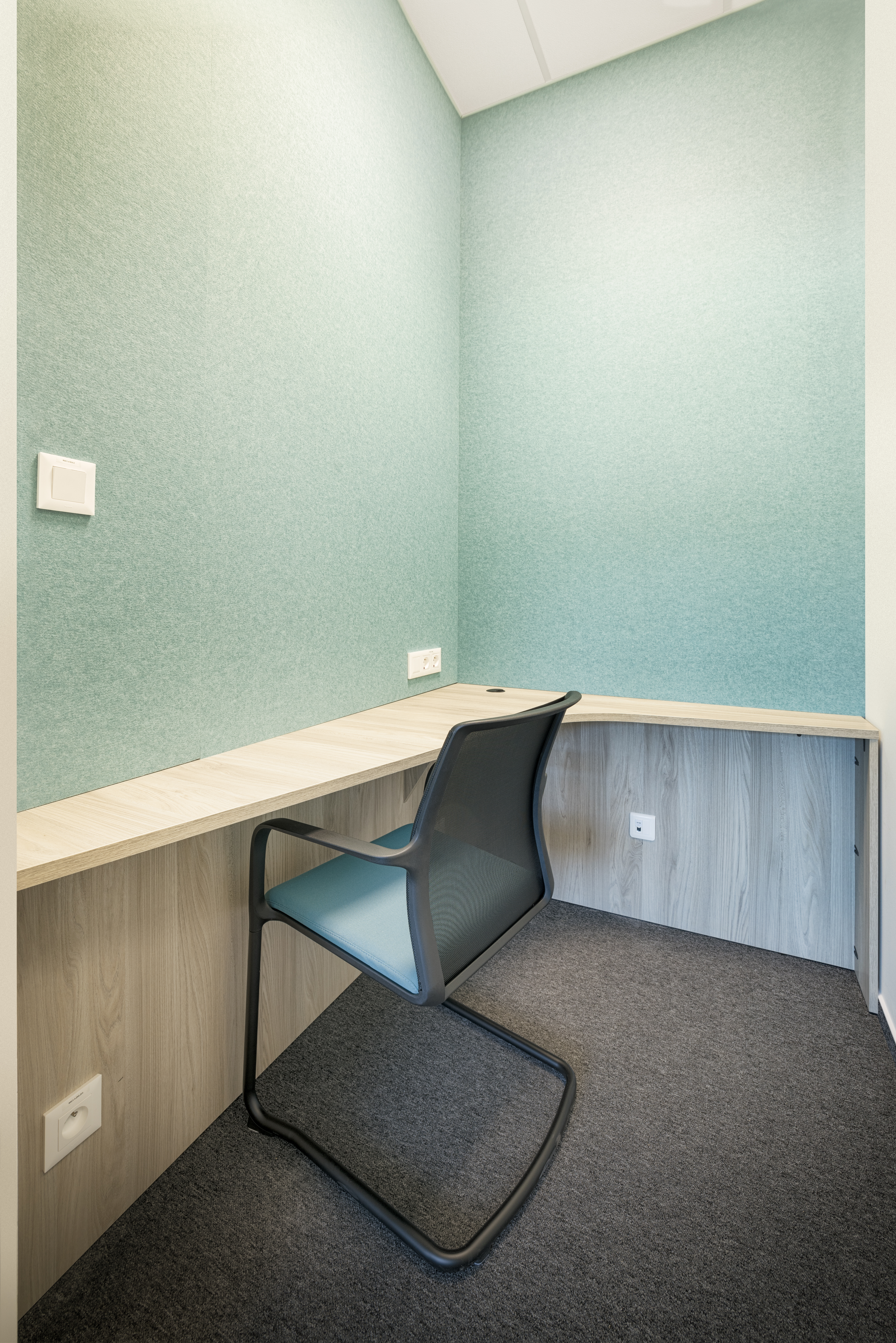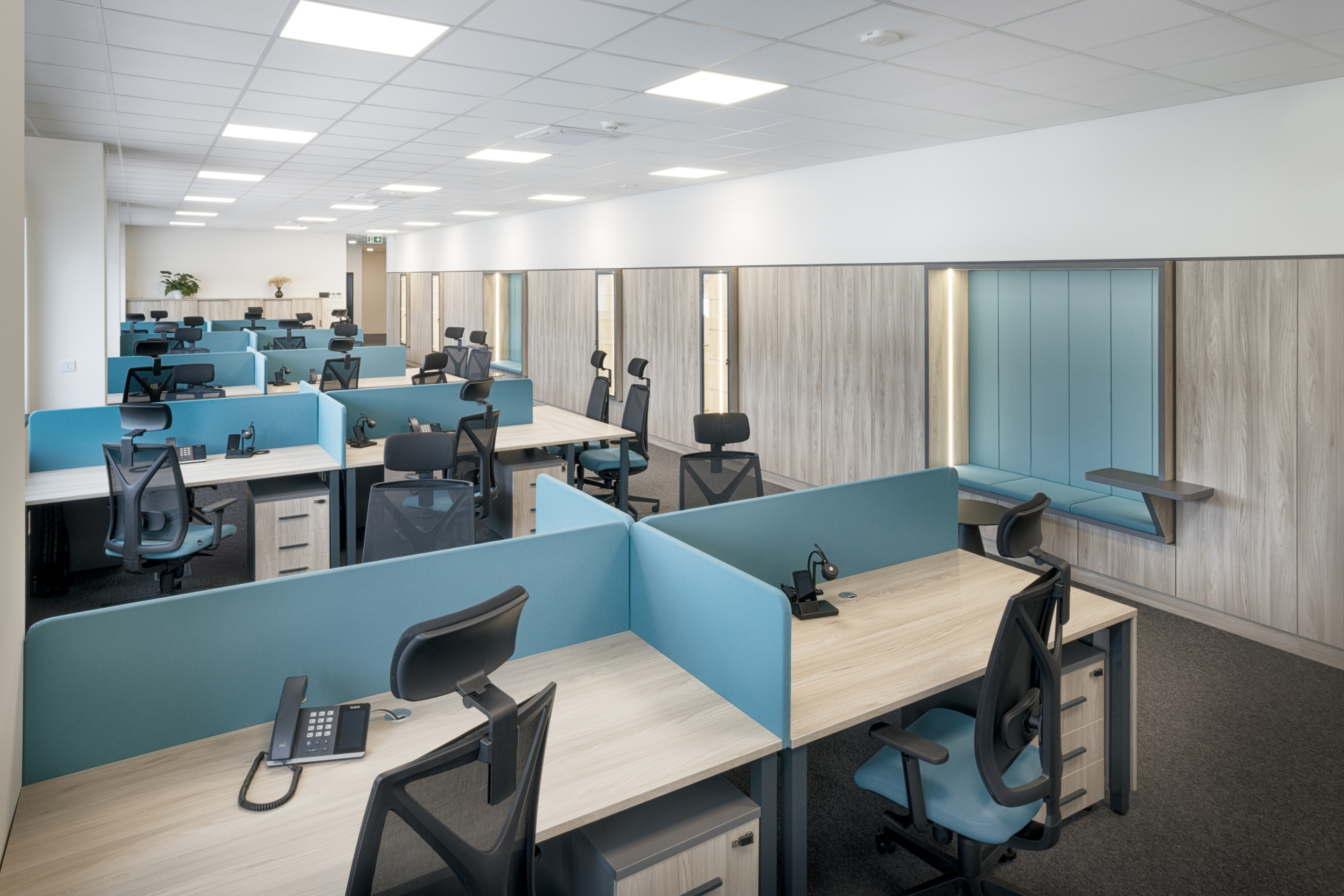 Call centre equipment including acoustic solution of the space. Recytex material used.