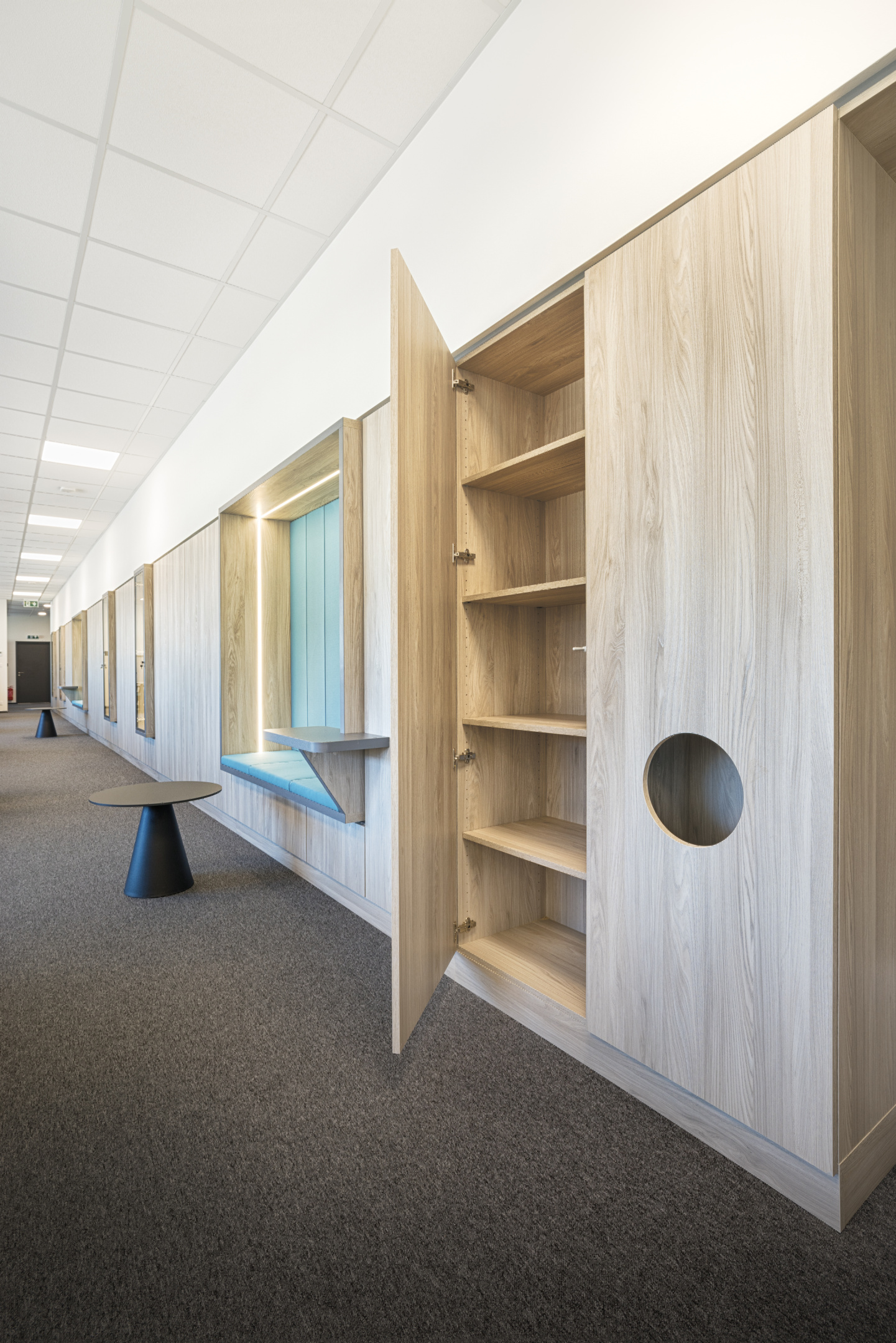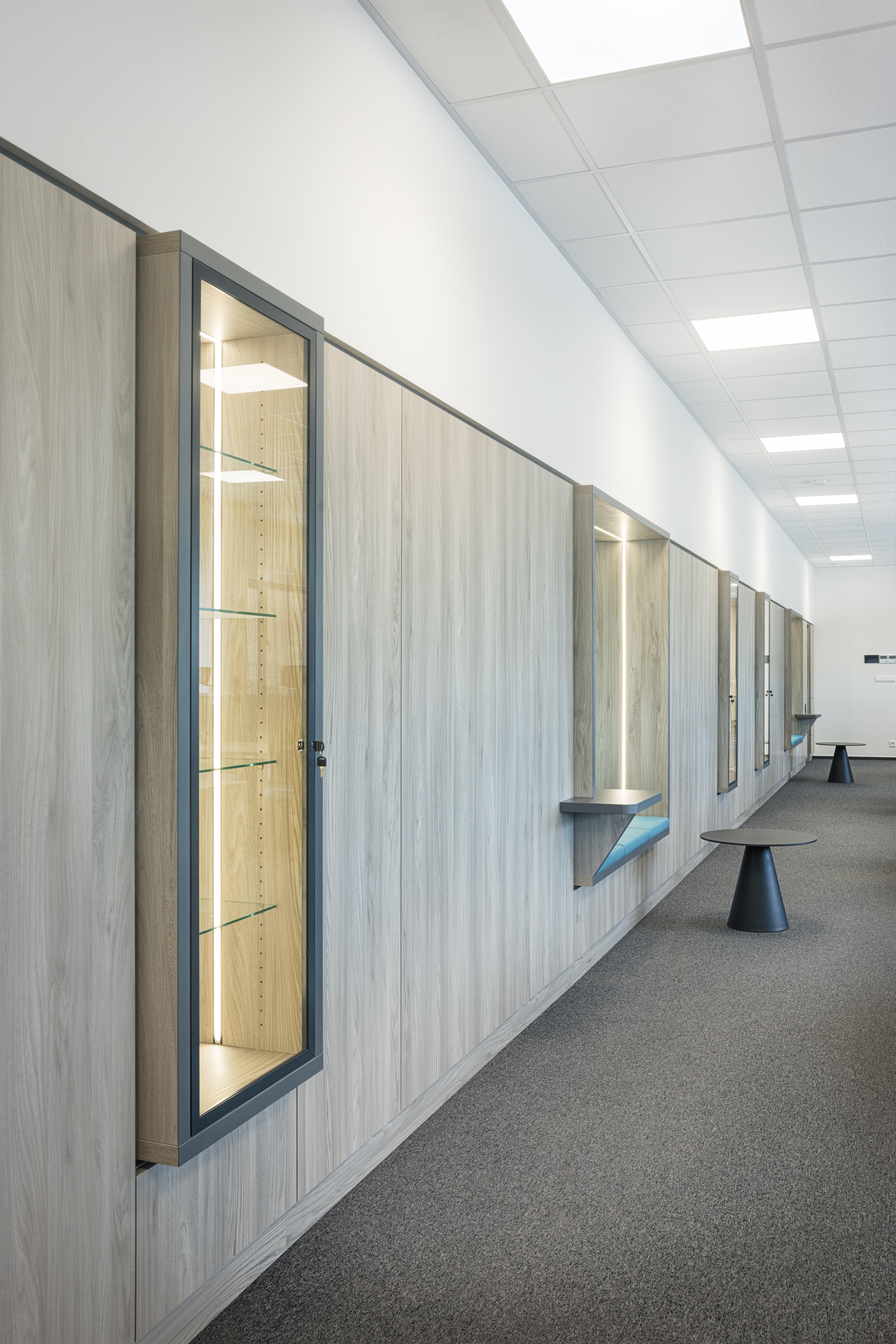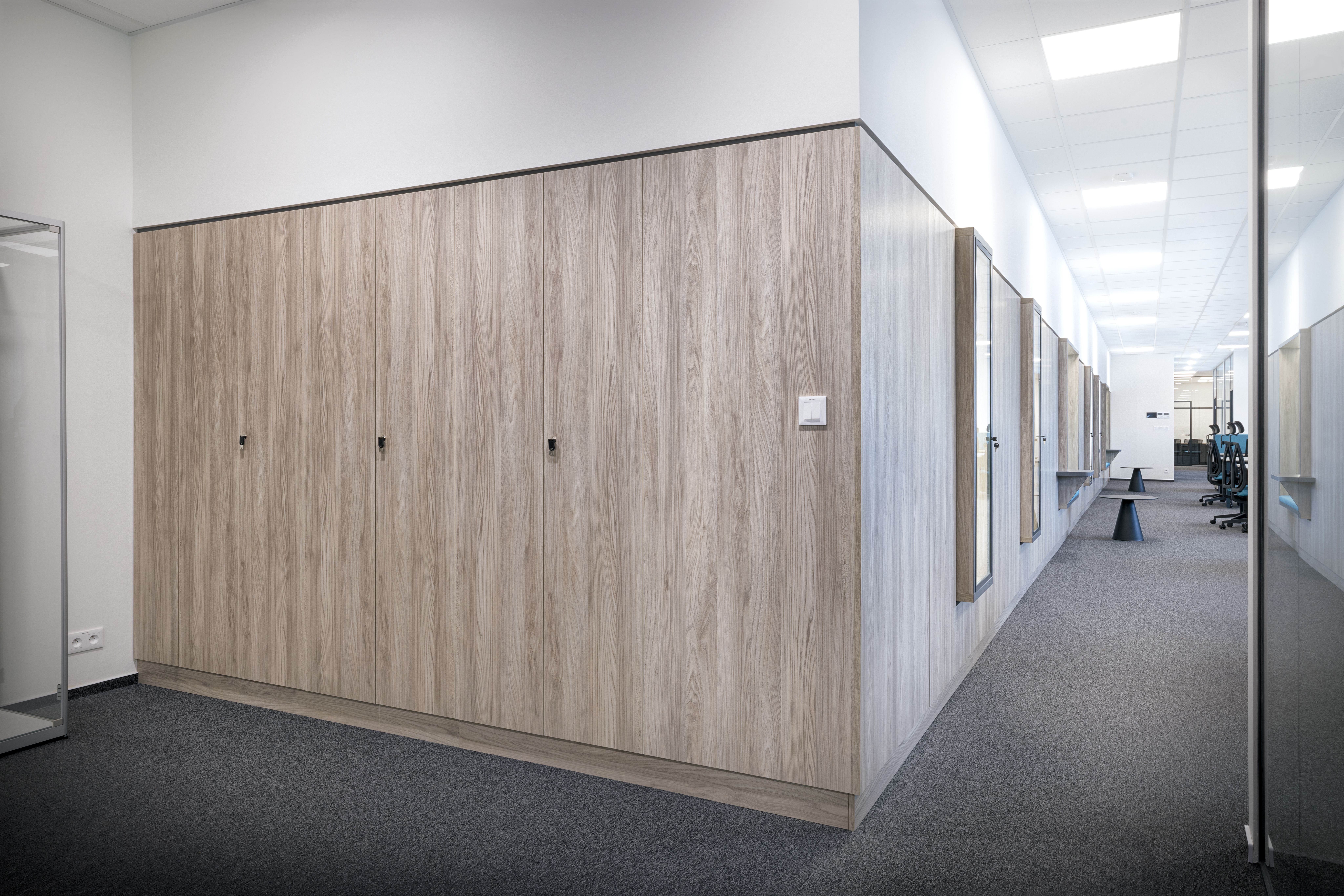 Modern open space with acoustic screens, storage walls, and integrated niche.