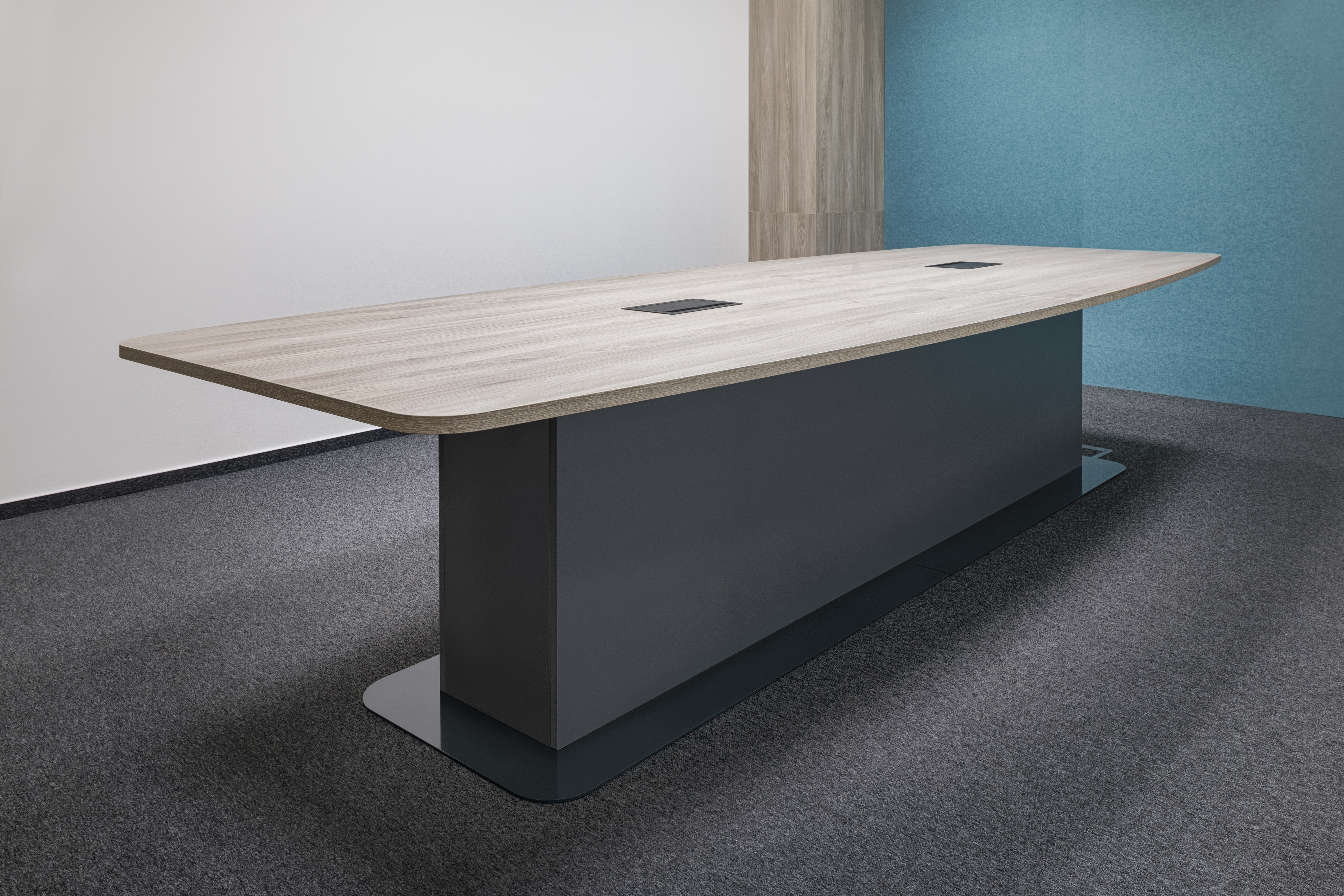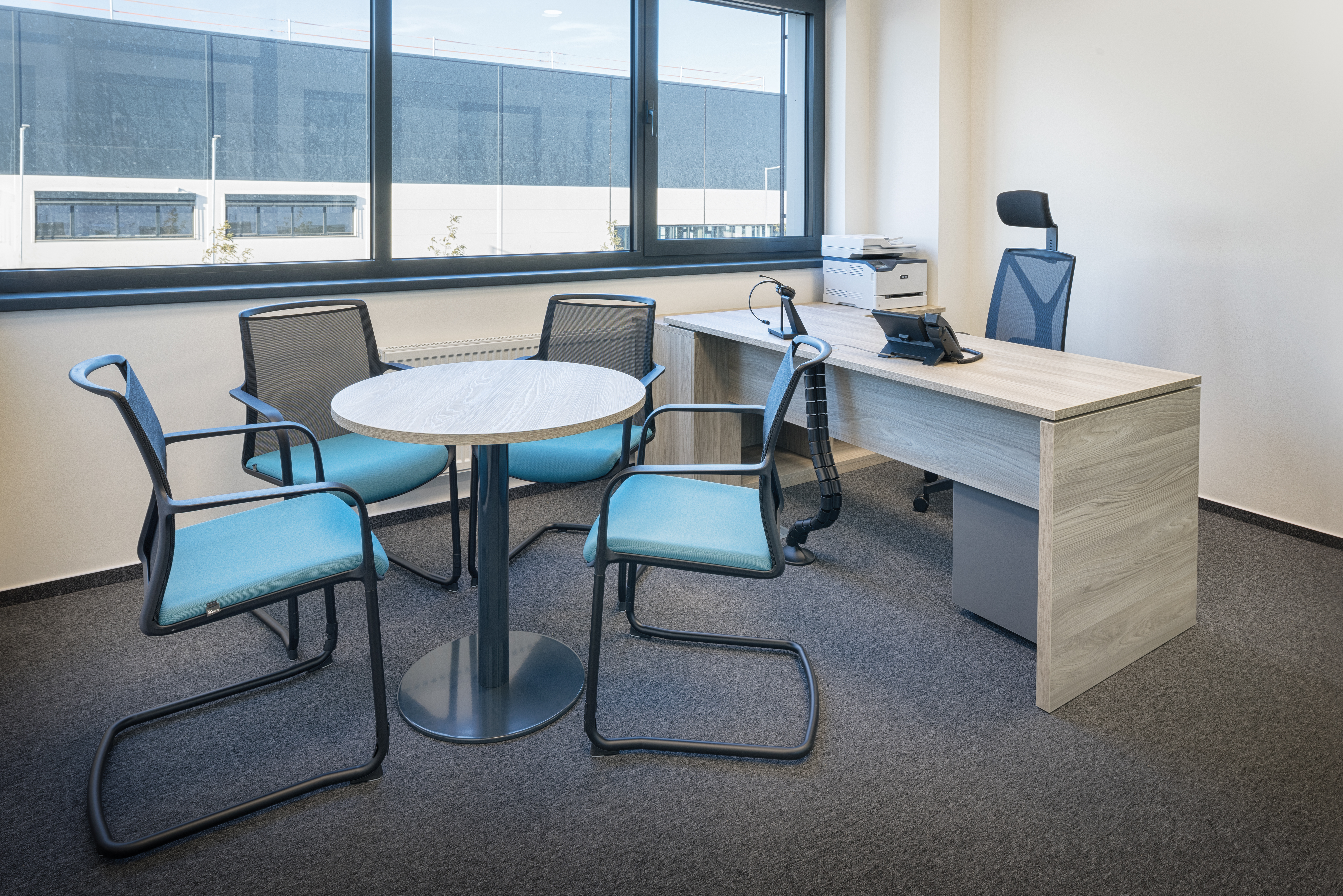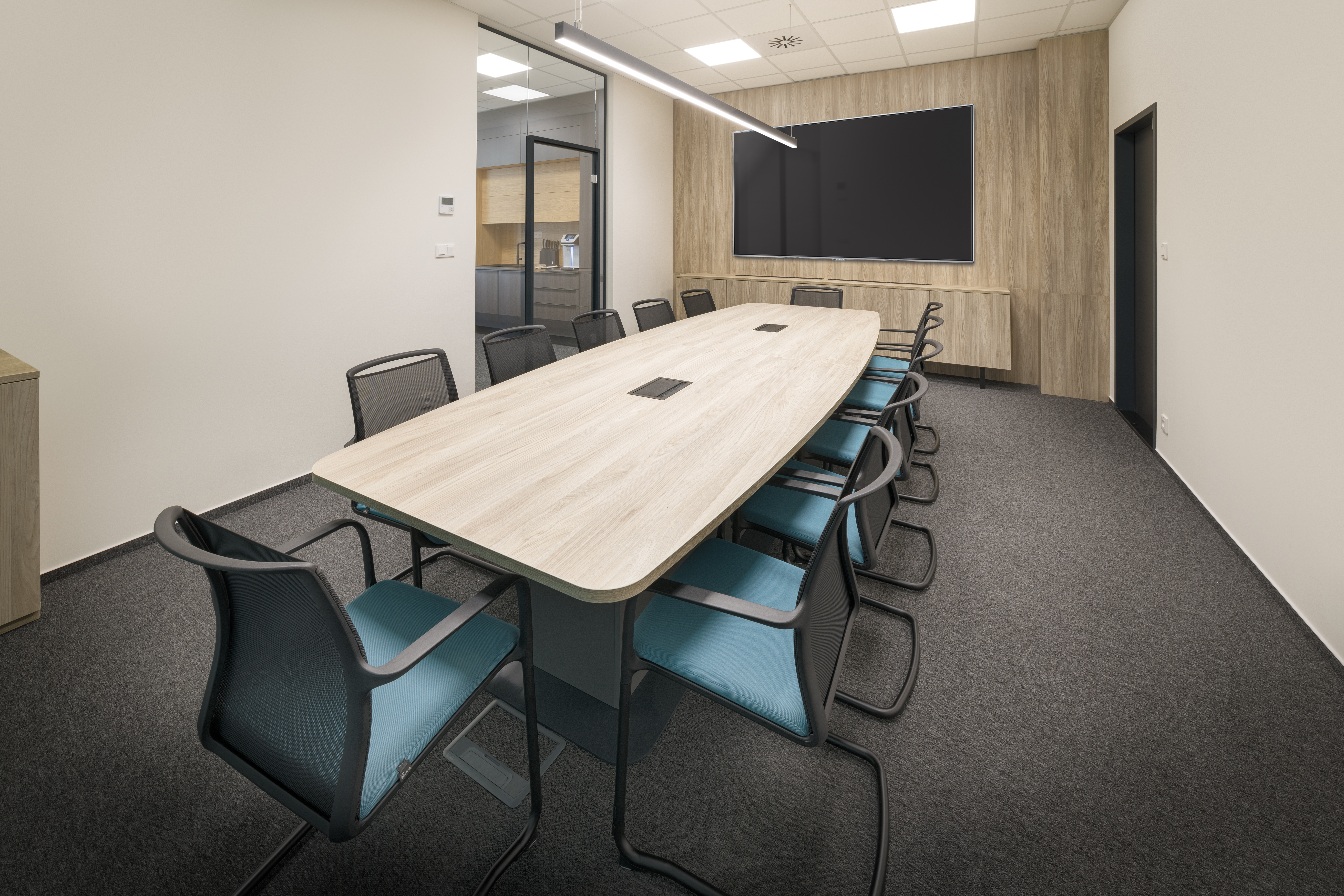 Modern open space with acoustic screens, storage walls, and integrated niche.